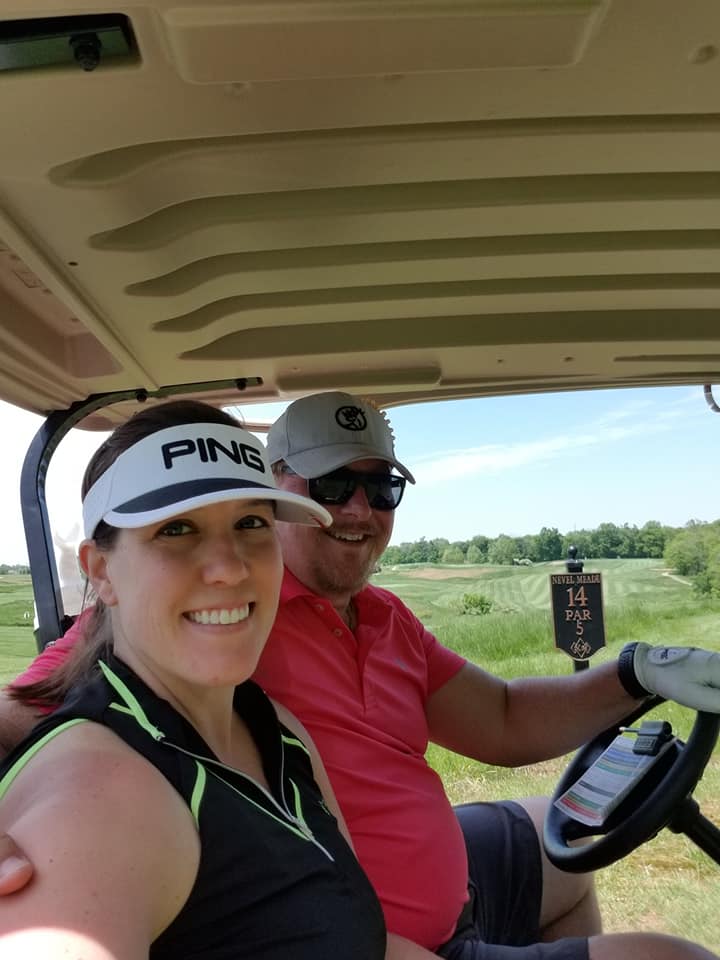 A couple of days after the race, we went to golf at Nevel Meade, a course I had found when I made the reservation. Of course as usual I made sure to have a few little gifts on the course for Dan to open, and pimped his ride with birthday streamers and the like. The course was a nice one, nothing to write home about though. And when we got there we were informed it was a dry course – no food, no drinks. Um…what?! LOL.